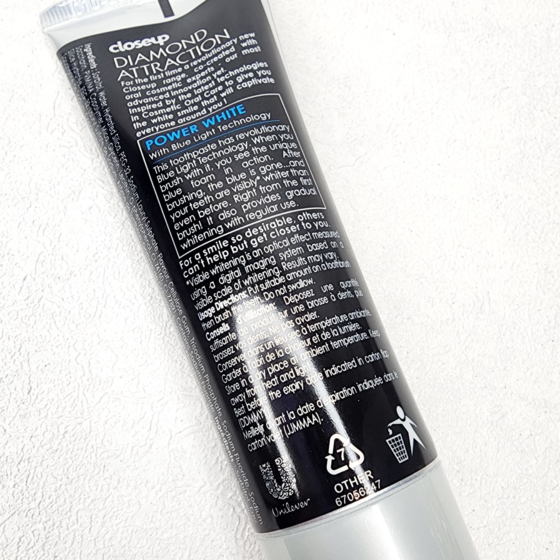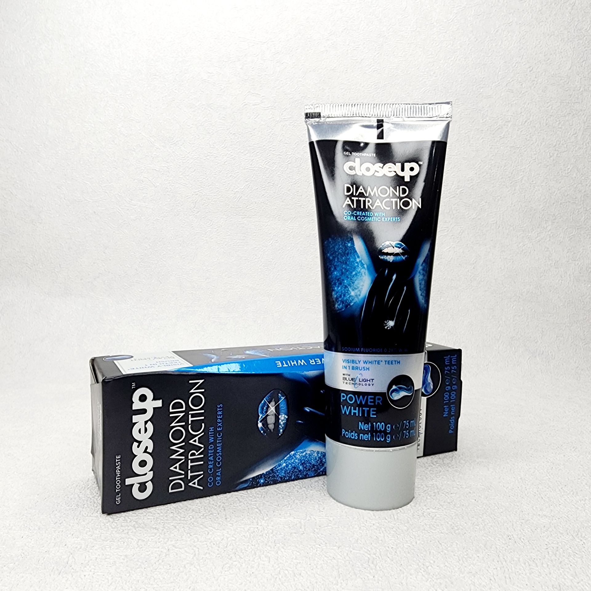 خمیر دندان سفید کننده Diamond Attraction کلوز آپ در حالت ژله ای، از مینای دندان ها محافظت پیشرفته ای خواهد نمود. این محصول مبتنی بر فلوراید و با فرمولاسیون خاص خود احساس طراوت و خنکی را بعد از هر بار استفاده به ارمغان خواهد آورد.تکنولوژی سفید کننده ی آنی دندانها، با نام “پرتو آبی” یا Blue Light دستاوردی نو در تولید سری انواع خمیر دندان سفید کننده می باشد. رنگ دانه های آبی موجود در ترکیبات این محصول با ایجاد کف آبی، سبب سفید شدن دندانها در اولین استفاده می شود.میزان سدیم فلوراید موجود در این محصول 21 درصد می باشد که سبب جلوگیری از پوسیدگی و حفاظت از دندانها و لثه ها می شود. با خمیر ژله ای الماس Close Up Power White از سفیدی دندانها و لبخند زیبای خود لذت ببرید.