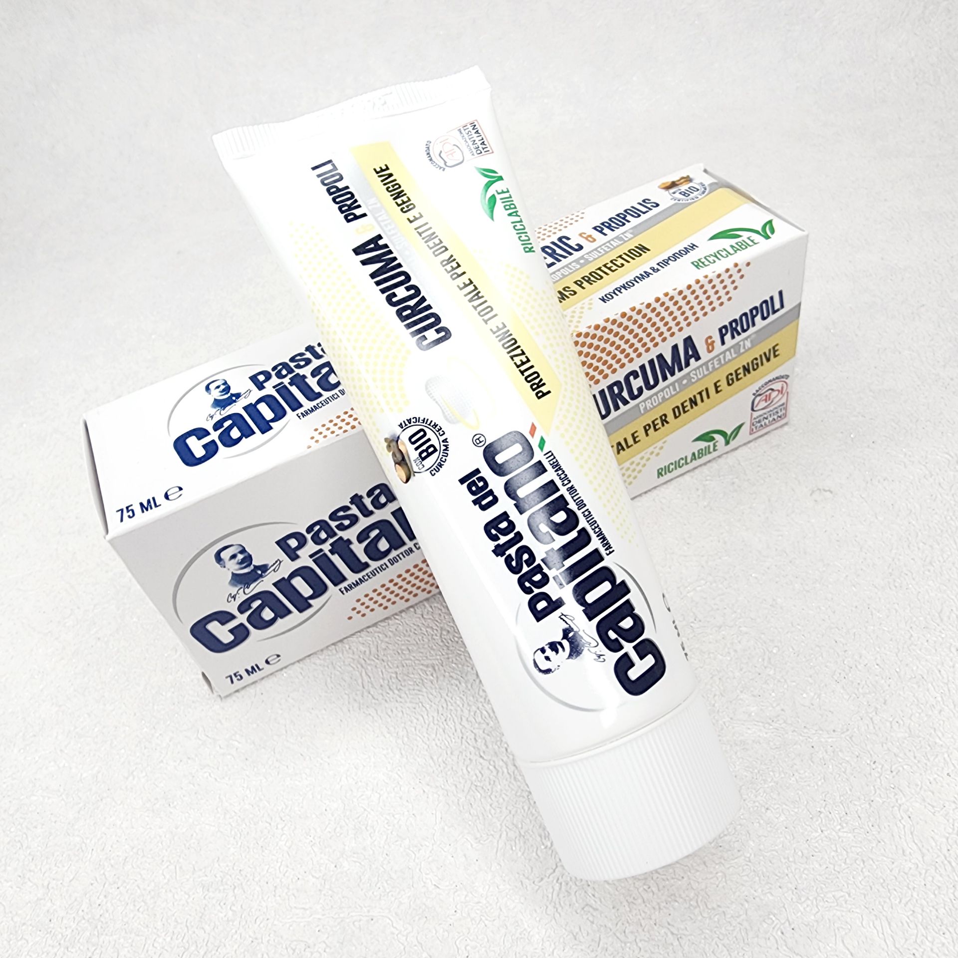 خمیر دندان زردچوبه کاپیتانو حاوی عصاره طبیعی زردچوبه و پروپولیس می باشد.خمیر دندان زردچوبه Capitano Curcuma And Propoli مینای دندان را تقویت و از ساییدگی، شکستگی و ترک خوردگی دندان ها جلوگیری می کند. خمیر دندان Curcuma And Propoli ضدباکتر و ضدالتهاب است. این خمیردندان کاپیتانو سفید کنندگی و جرم گیری چشمگیری دارد. این محصول فاقد فلوراید بوده و بدلیل داشتن پایه زردچوبه مناسب لثه های حساس و ملتهب میباشد.