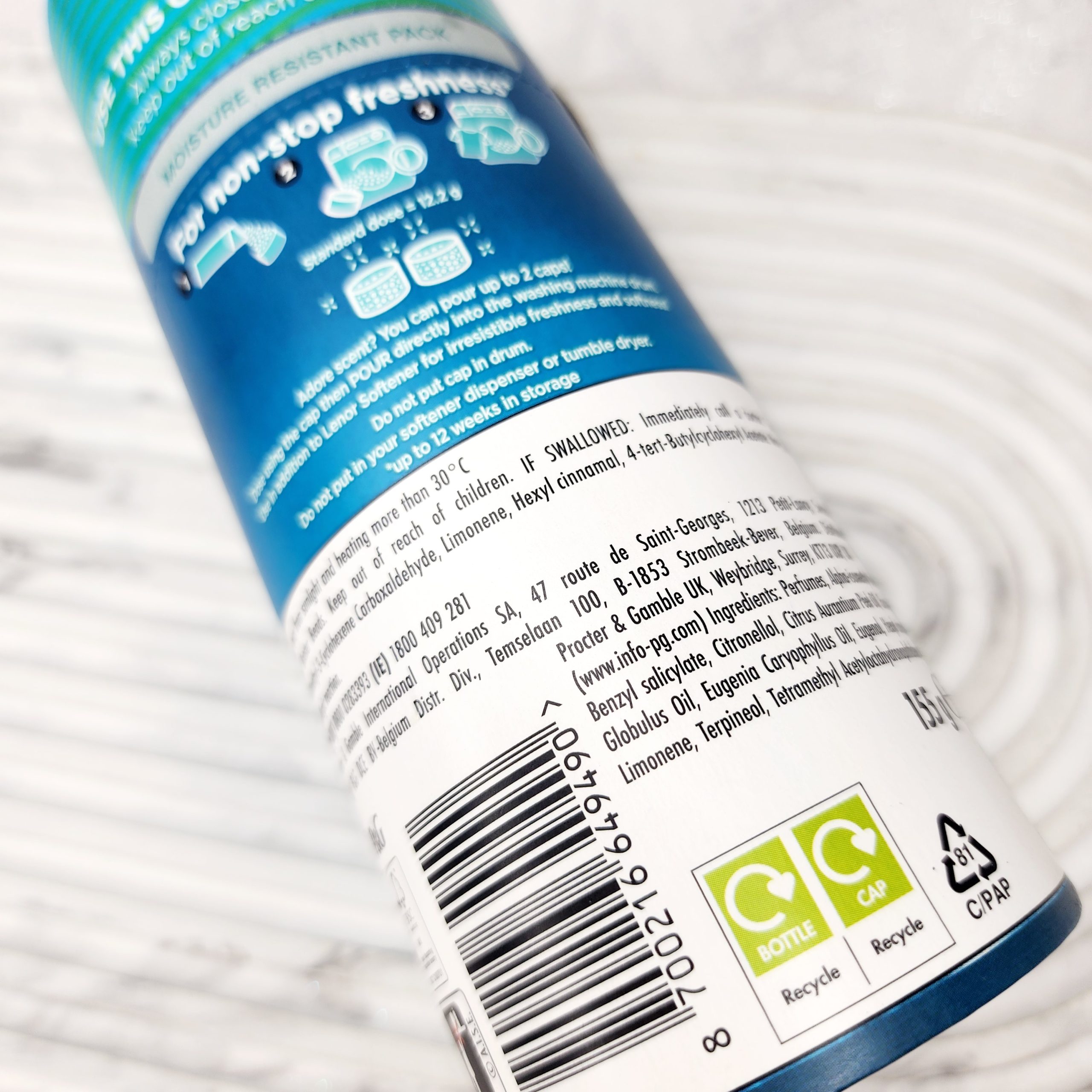 برای استفاده از خوشبو کننده لباس لنور Lenor، از درپوش آن له عنوان پیمانه استفاده کنید .