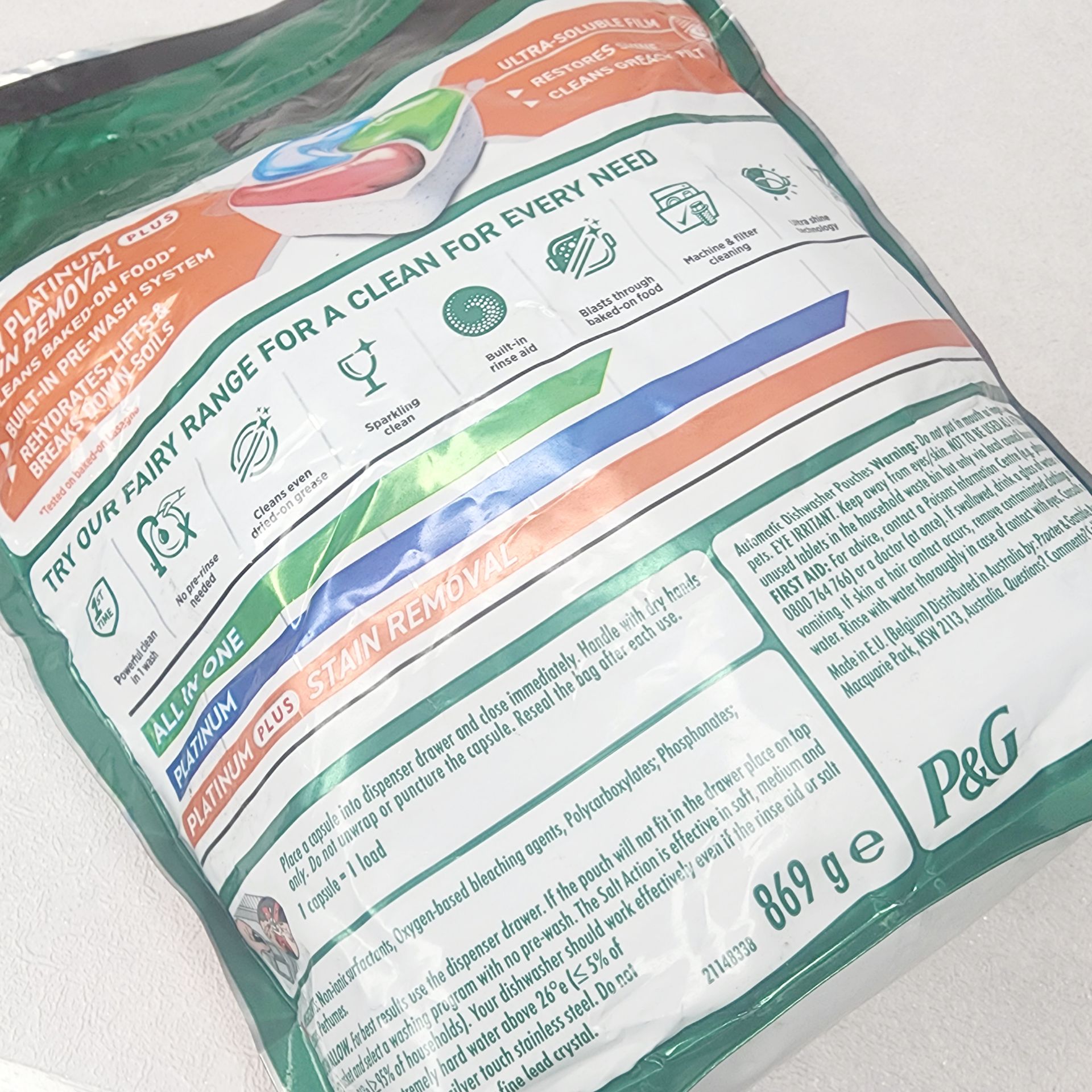 تکنولوژی ANTI-MAT این محصول، ظاهر مات و کدر که در طول زمان در ظرف ها به وجود می آید را از بین می برد و به براق و درخشان شدن هر چه بیشتر ظروف کمک شایانی می کند. به علاوه با چربی زدایی و جلوگیری از ایجاد جرم در فیلتر و قسمت های پنهان ماشین ظرفشویی باعث افزایش عملکرد دستگاه و کاهش هزینه تعمیرات آن می گردد. از دیگر مزایای خوب قرص پلاتینیوم پلاس می توان به عملکرد بالا در برنامه های زمان کوتاه، قابلیت حل شدن سریع، محافظت از ظروف با جنس نقره اشاره کرد.