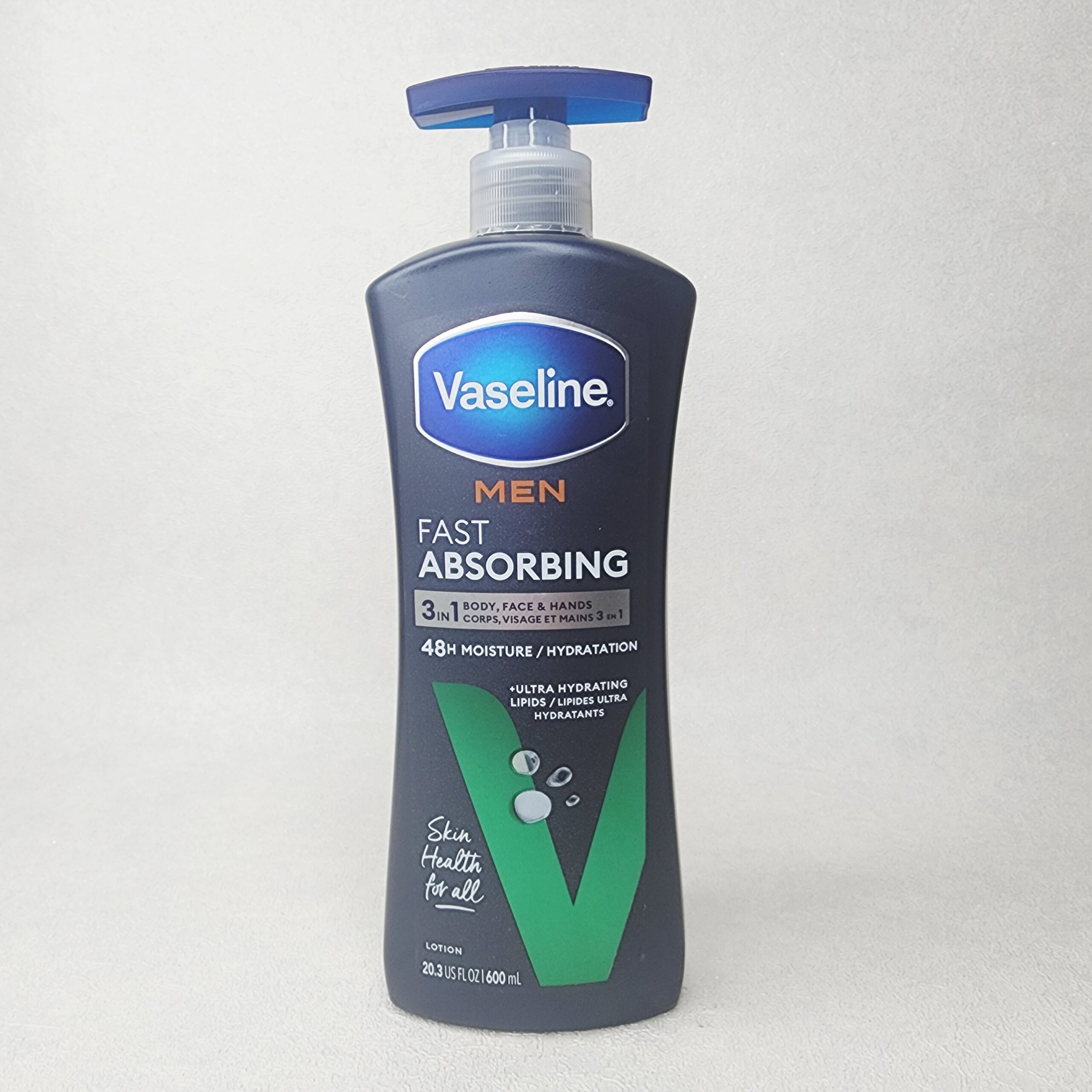 لوسیون بدن مردانه 3 در 1 وازلین مدل FAST ABSORBING رطوبت رسان 48 ساعته با فرمولاسیون بسیار ملایم و زود جذب مناسب بدن، دست ها و صورت می باشد. این لوسیون بدن از لیپیدهای آبرسان فوق العاده قوی جهت حبس رطوبت هر چه بهتر در پوست و تغذیه و تقویت سد دفاعی آن بهره می برد.