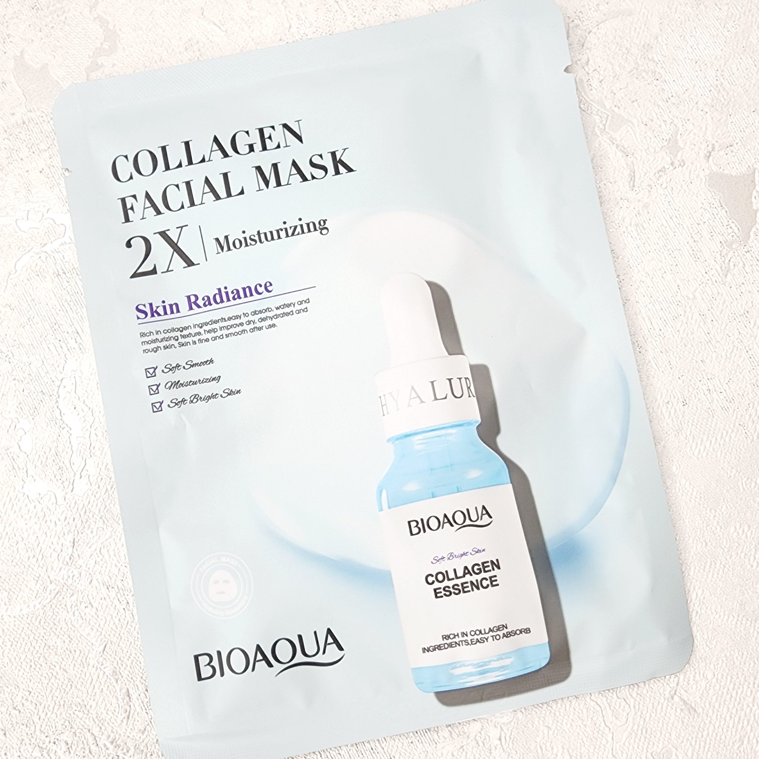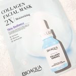 ماسک ورقه ای صورت روشن کننده کلاژن بیوآکوا BIOAQUA با بهره مندی از کلاژن موجب تقویت بافت پوست شده و به آن استحکام می بخشد. این ماسک صورت به بازیابی خاصیت ارتجاعی پوست کمک نموده و در درازمدت چروک های پوستی را هموار می سازد. این محصول روشن کننده و شفاف کننده پوست صورت بوده و در رفع تیرگی های پوست موثر است. با این ماسک خشکی پوست از بین رفته و رطوبت مورد نیاز بافت سلولی پوست تامین خواهد شد.